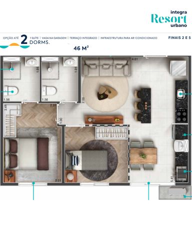 2 Dormitórios (53 m²) com 1 Suíte.