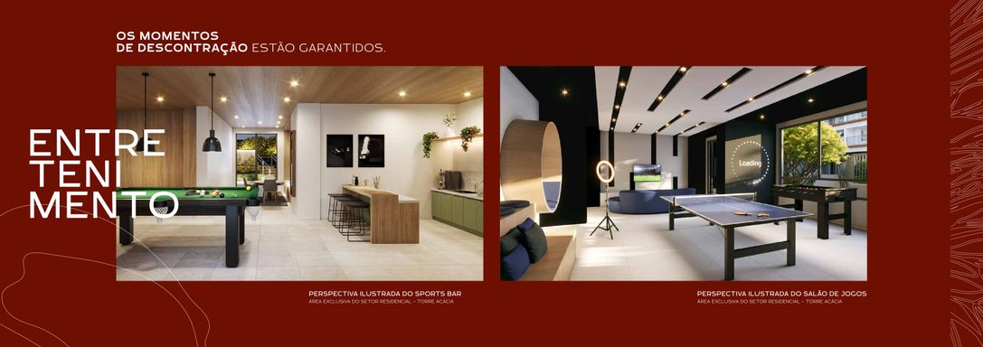 Laser: Coworking / Sports bar / Salão de Jogos / Playgroud / Brinquedoteca / Fitness / Suana / Lobby / Churrasqueira / Espaço Goumert / Salão de Festas / Lareira / Piscina