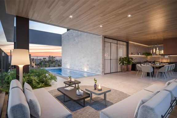 Laser: Piscina coberta no rooftop com raia de 25 m / Quadra de tênis / Academia / fitness / Spa / Brinquedoteca / Salão de festas / salão de eventos / gourmet